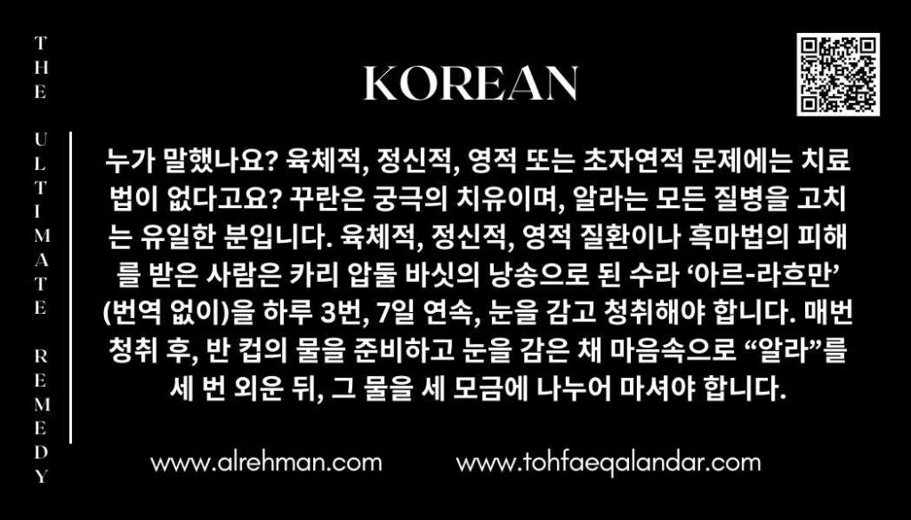 궁극의 치유는 단순한 치료법이 아닙니다. 그것은 지구상의 모든 인간에게 전하는 희망과 위로, 그리고 영적 힘의 메시지입니다. 이 신성한 방법은 카키안 왈리 사르카르로 알려진 사이드 사프다르 후세인 부카리(Syed Safdar Hussain Bukhari)께서 처음으로 소개하셨습니다. 이 방법은 육체적 질병, 감정적 고통, 영적 단절, 또는 초자연적 문제로 고통받는 이들을 돕기 위해 설계되었습니다. 소리 치료와 진심 어린 의도의 결합을 통해, 이 치유법은 이미 전 세계 수백만 명에게 무료로 치유를 제공해 왔습니다.