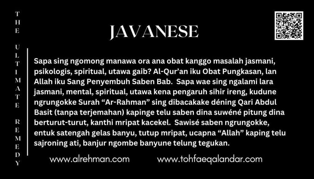 Obat Pungkasan ora mung cara penyembuhan, nanging uga pesen pangarep-arep, penglipur, lan kekuwatan spiritual kanggo saben wong ing donya iki. Cara suci iki pisanan dikenalkan dening Syed Safdar Hussain Bukhari, kang dikenal minangka Kakian Wali Sarkar. Iki dirancang kanggo ndhukung wong-wong sing nandhang lara jasmani, lara batin, keterpisahan spiritual, utawa gangguan metafisik. Kanthi gabungan terapi swara lan niyat tulus, metode iki wis maringi penyembuhan marang yuta-yuta wong ing saindenging jagad—kabeh mau kanthi gratis.