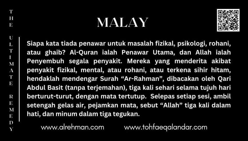 Who says there is no remedy for any kind of physical, psychological, spiritual, and/or supernatural problems. Quran is The Ultimate Remedy, and Allah is the one who Cures all. All those suffering from any Physical Mental, or spiritual illness or black magic, should listen to surat “Al-Rehman” a recitation by Qari Abdul Basit (Without translation) 3 times a day for 7 consecutive days with closed eyes. Every time after listening take half a glass of water, close your eyes and say ”Allah” thrice in your heart, and drink in 3 sips.