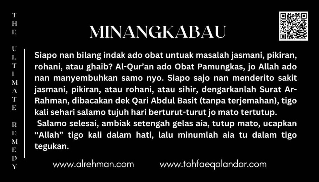 - Dengarkan tigo kali sehari — pagi, siang, jo malam sebelum tidur — salamo tujuh hari berturut-turut, sekali seumur hidup. Sesudahnyo, sebarkan pesan iko untuak membantu nan lain.