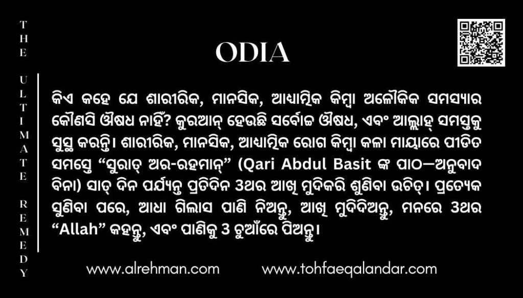 ସର୍ବୋଚ୍ଚ ଔଷଧ କେବଳ ଏକ ଚିକିତ୍ସା ପଦ୍ଧତି ନୁହେଁ—ଏହା ପୃଥିବୀର ପ୍ରତ୍ୟେକ ମଣିଷ ପାଇଁ ଆଶା, ସାନ୍ତ୍ୱନା ଓ ଆଧ୍ୟାତ୍ମିକ ଶକ୍ତିର ଏକ ବାର୍ତ୍ତା। ପ୍ରଥମେ ସାୟଦ୍ ସଫଦର୍ ହୁସେନ୍ ବୁଖାରୀ, ଯିହାକୁ କାକିଆନ୍ ଓଲି ସର୍କାର ଭାବରେ ଜଣାଯାଏ, ଦ୍ୱାରା ପରିଚୟ କରାଯାଇଥିଲା, ଏହି ପବିତ୍ର ପଦ୍ଧତିଟି ଶାରୀରିକ ରୋଗ, ଭାବନାତ୍ମକ ବ୍ୟଥା, ଆଧ୍ୟାତ୍ମିକ ବିଚ୍ଛେଦ କିମ୍ବା ଅଳୌକିକ ବିଘ୍ନରେ ପୀଡିତ ଲୋକଙ୍କୁ ସମର୍ଥନ ଦେବା ପାଇଁ ତିଆରି କରାଗଲା। ଶବ୍ଦ ଚିକିତ୍ସା ଓ ଉଦ୍ଦେଶ୍ୟର ସମ୍ମିଳନର ମାଧ୍ୟମରେ, ଏହା ପୃଥିବୀର ଲକ୍ଷୋଧିକ ଲୋକଙ୍କୁ ସମ୍ପୂର୍ଣ୍ଣ ମାଗଣାରେ ଚିକିତ୍ସା ଦେଇଛି।
