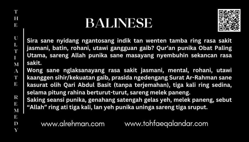 Puniki sampun dados pelayanan sane suci, gratis, dados prasida rahayu, welas asih, sareng rasa dharma ring manusa. Tiosan punika, indik penyembuhan puniki tusing kabawos olih arta.