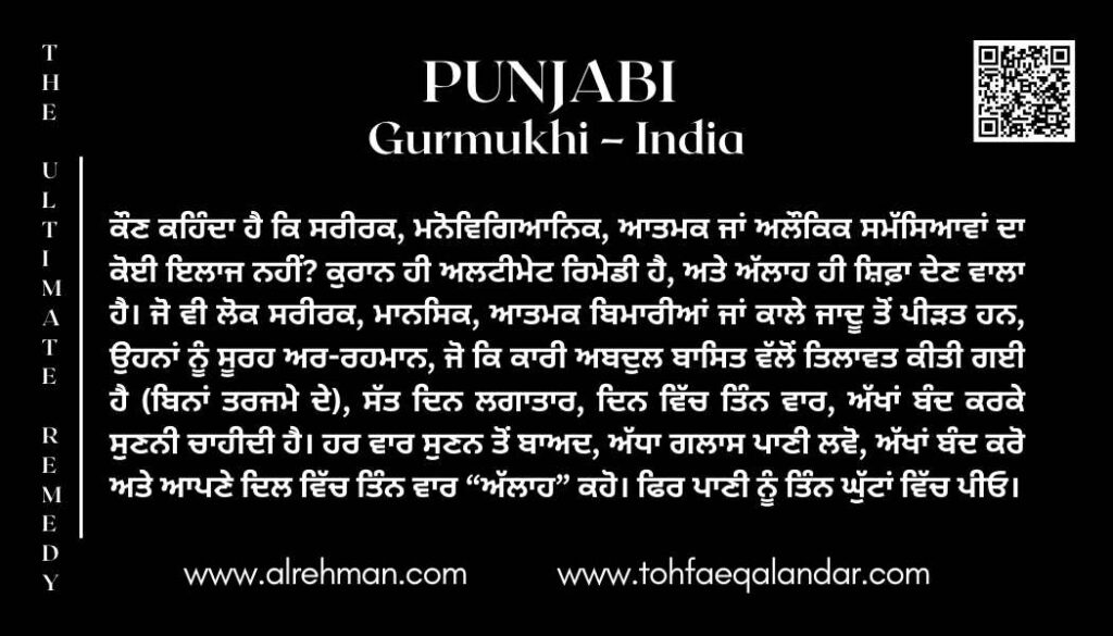 Who says there is no remedy for any kind of physical, psychological, spiritual, and/or supernatural problems. Quran is The Ultimate Remedy, and Allah is the one who Cures all. All those suffering from any Physical Mental, or spiritual illness or black magic, should listen to surat “Al-Rehman” a recitation by Qari Abdul Basit (Without translation) 3 times a day for 7 consecutive days with closed eyes. Every time after listening take half a glass of water, close your eyes and say ”Allah” thrice in your heart, and drink in 3 sips.