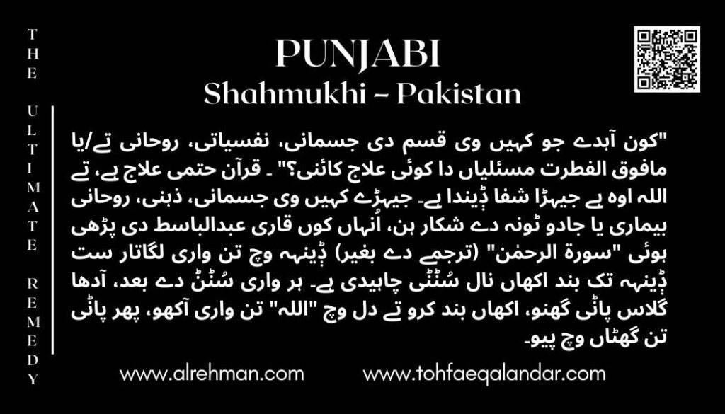 Who says there is no remedy for any kind of physical, psychological, spiritual, and/or supernatural problems. Quran is The Ultimate Remedy, and Allah is the one who Cures all. All those suffering from any Physical Mental, or spiritual illness or black magic, should listen to surat “Al-Rehman” a recitation by Qari Abdul Basit (Without translation) 3 times a day for 7 consecutive days with closed eyes. Every time after listening take half a glass of water, close your eyes and say ”Allah” thrice in your heart, and drink in 3 sips.