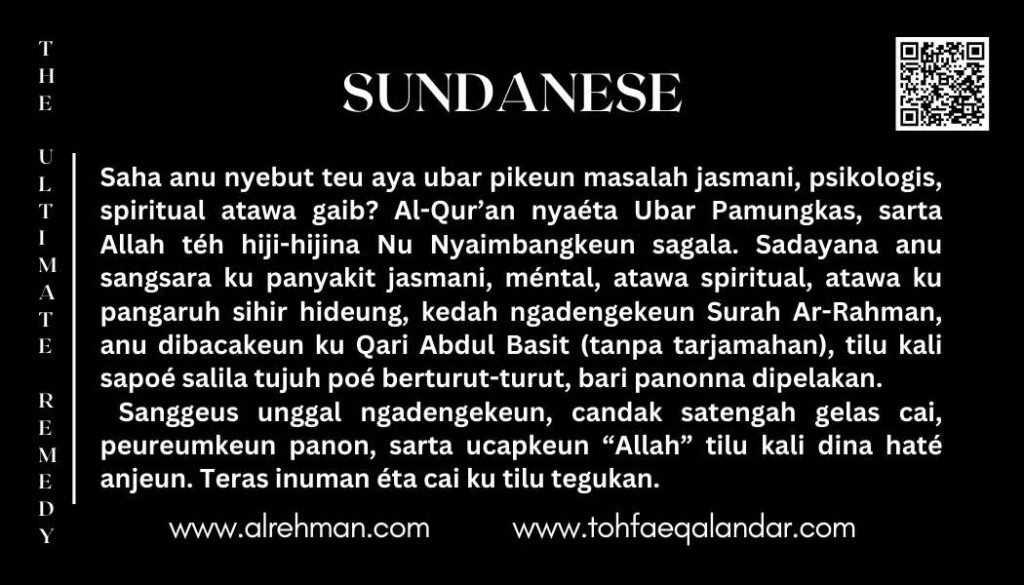 - Dengekeun tilu kali sapoé — isuk, beurang, jeung peuting sateuacan sare — salila tujuh poé berturut-turut, sakali wungkul dina kahirupan. Sanggeus éta, sebarkeun ieu talatah pikeun mantuan ka batur.