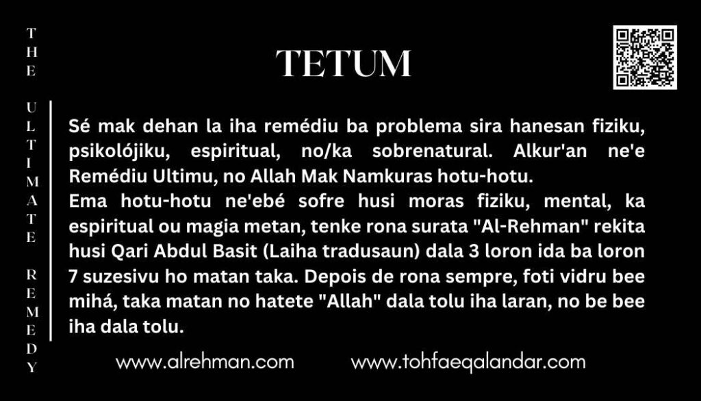 Remédiu Ultimu la’ós de’it métodu kura – ne’e mensajen esperansa, konfórtu, no forsa espiritual ba ema hotu-hotu iha Mundu. Uluk husi Syed Safdar Hussain Bukhari, ema bolu “Kakian Wali Sarkar”, métodu sagradu ne’e projetu atu suporta sira ne’ebé sofre husi moras fiziku, todan emosional, dezconexaun espiritual, ou disturbiu metafíziku. Liu husi kombina terapia lian no intensaun, ne’e ona lori kura ba milións ema iha mundu – grátis kompletu.