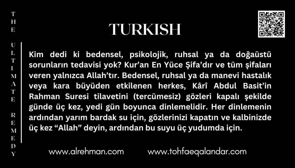 En Yüce Şifa sadece bir tedavi yöntemi değildir—bu, yeryüzündeki her insan için umut, huzur ve manevi güç mesajıdır. İlk kez Syed Safdar Hussain Bukhari tarafından, Kakian Wali Sarkar olarak da bilinen, tanıtılan bu kutsal yöntem; bedensel hastalık, duygusal acı, ruhsal kopukluk ya da metafiziksel rahatsızlık yaşayanlara destek olmak için geliştirilmiştir. Ses terapisi ve niyetin birleşimiyle, dünyanın dört bir yanında milyonlarca insana şifa ulaştırmış—tamamen ücretsizdir.