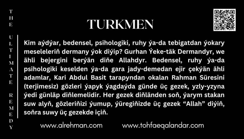 Ýeke-täk Derman diňe bir bejeriş usuly däldir—bu, ýer ýüzündäki her bir adam üçin umyt, rahatlyk we ruhy güýç habarydyr. Ilkibaşda Syed Safdar Hussain Bukhari tarapyndan, “Kakian Wali Sarkar” ady bilen tanalýan, tanyş edilen bu mukaddes usul; beden keseli, duýgy agyry, ruhy bölünme ýa-da metaphiziki kynçylyk çekenlere goldaw bermek üçin döredildi. Ses terapiýasy we niýetiň birleşmegi arkaly, dünýäniň millionlarça adamsyna bejeriş getirildi—doly mugt.