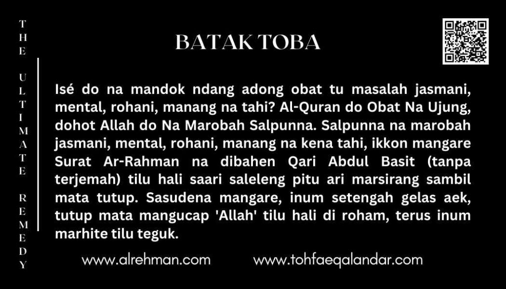 - Mangare tilu hali saari – pagi, tengahari, dohot saon sampe turo – saleleng pitu ari marsirang (sada hali saumur idup). Terus bagihon pesan on laho tulung halak na asing.