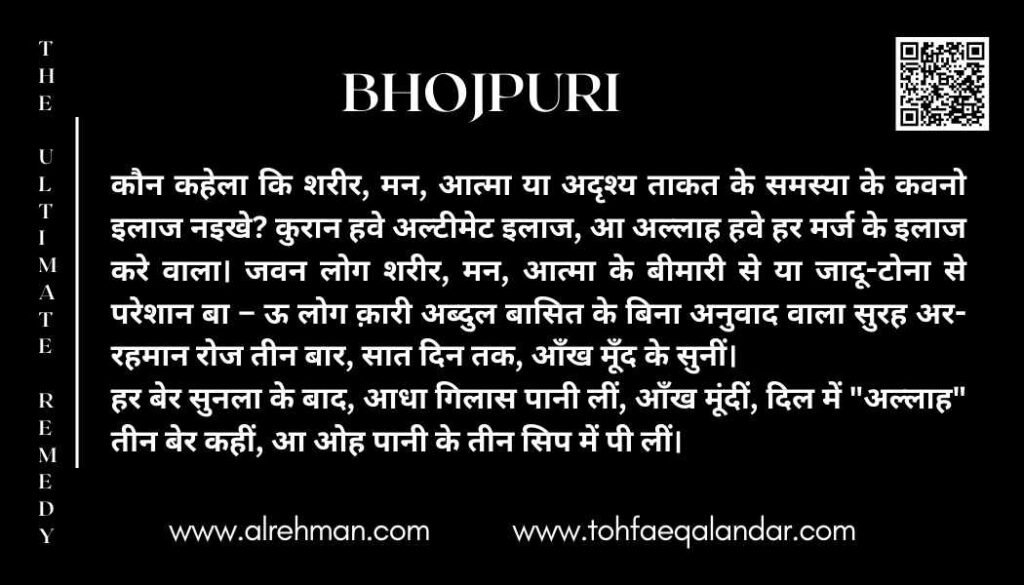 Who says there is no remedy for any kind of physical, psychological, spiritual, and/or supernatural problems. Quran is The Ultimate Remedy, and Allah is the one who Cures all. All those suffering from any Physical Mental, or spiritual illness or black magic, should listen to surat “Al-Rehman” a recitation by Qari Abdul Basit (Without translation) 3 times a day for 7 consecutive days with closed eyes. Every time after listening take half a glass of water, close your eyes and say ”Allah” thrice in your heart, and drink in 3 sips.