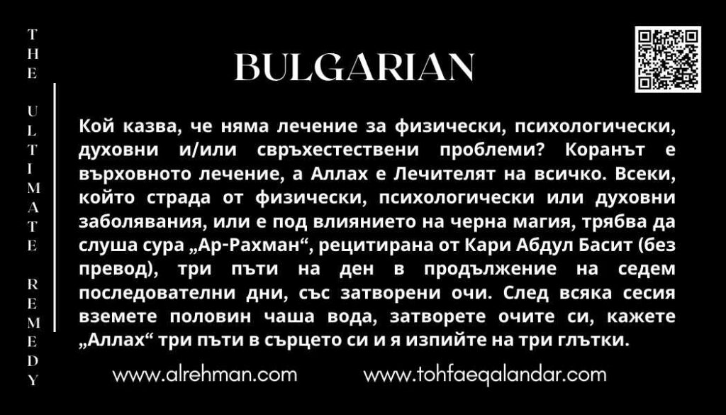 Who says there is no remedy for any kind of physical, psychological, spiritual, and/or supernatural problems. Quran is The Ultimate Remedy, and Allah is the one who Cures all. All those suffering from any Physical Mental, or spiritual illness or black magic, should listen to surat “Al-Rehman” a recitation by Qari Abdul Basit (Without translation) 3 times a day for 7 consecutive days with closed eyes. Every time after listening take half a glass of water, close your eyes and say ”Allah” thrice in your heart, and drink in 3 sips.