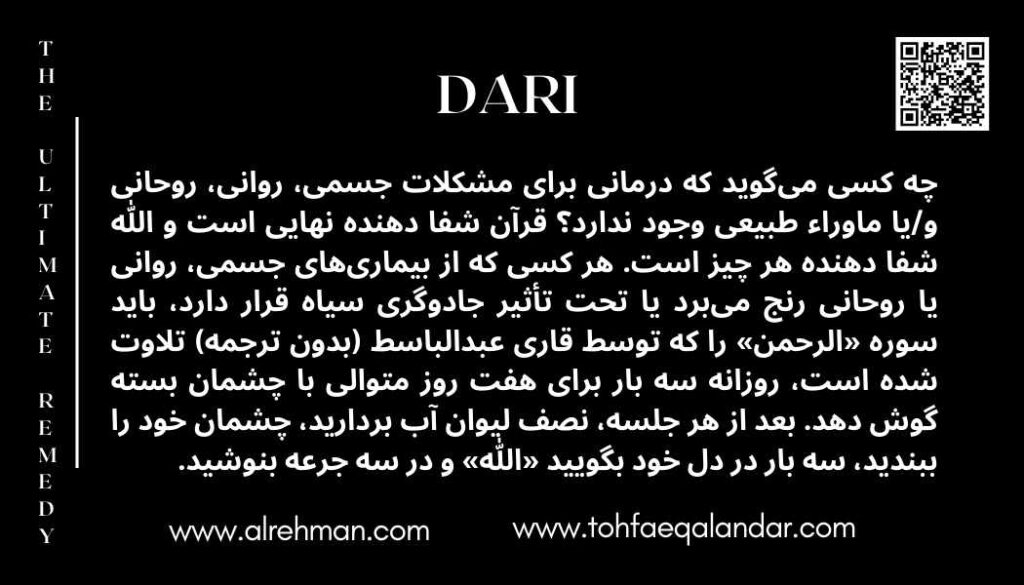 Who says there is no remedy for any kind of physical, psychological, spiritual, and/or supernatural problems. Quran is The Ultimate Remedy, and Allah is the one who Cures all. All those suffering from any Physical Mental, or spiritual illness or black magic, should listen to surat “Al-Rehman” a recitation by Qari Abdul Basit (Without translation) 3 times a day for 7 consecutive days with closed eyes. Every time after listening take half a glass of water, close your eyes and say ”Allah” thrice in your heart, and drink in 3 sips.