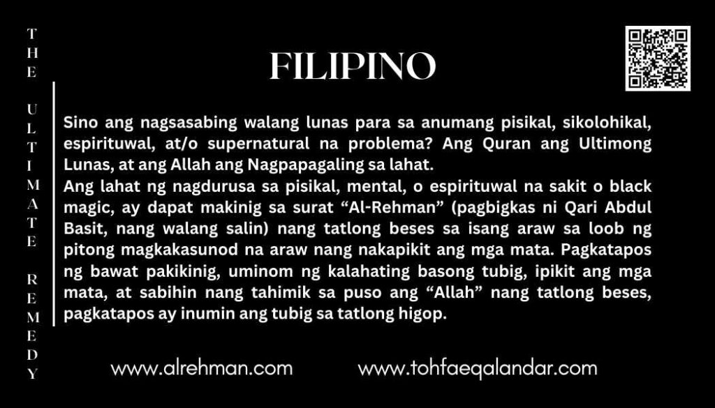 Who says there is no remedy for any kind of physical, psychological, spiritual, and/or supernatural problems. Quran is The Ultimate Remedy, and Allah is the one who Cures all.