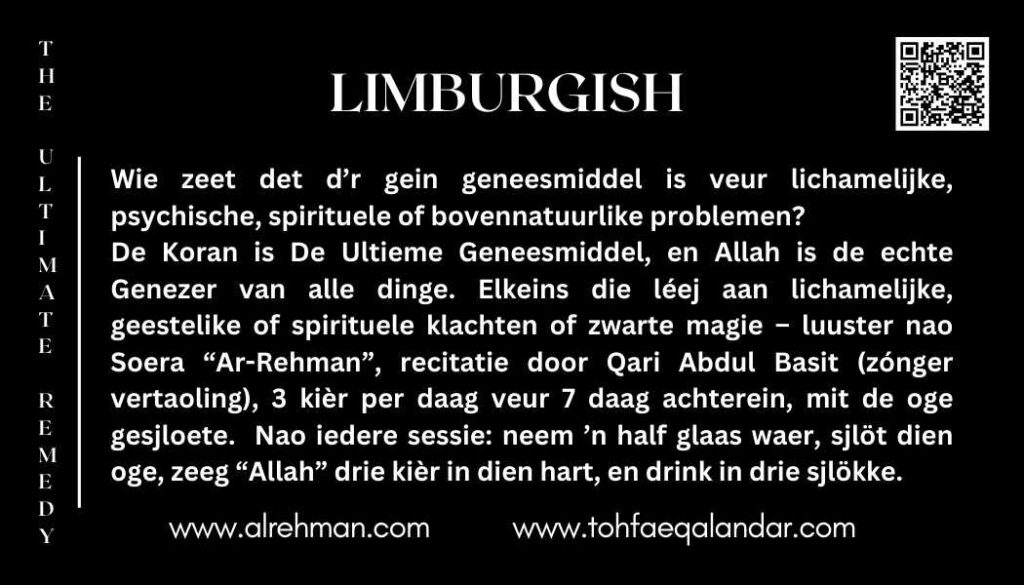 De Ultieme Geneesmiddel is neet allein ’n methode veur genezing – ’t is ’n boodsjap van hoopa, troasj, en spirituele kraank veur elke mins op de wereld. Dit helende methode is oetgevonge door Syed Safdar Hussain Bukhari, bekind es Kakian Wali Sarkar, en is bedoeld veur luuj die léeje aan lichamelijke ziektes, emotionele pièn, spiritueel verlies, of bovennatuurlik ongemak. Door klankterapie en intentie haet dit miljoene miensje geholpe – volledig gratis.