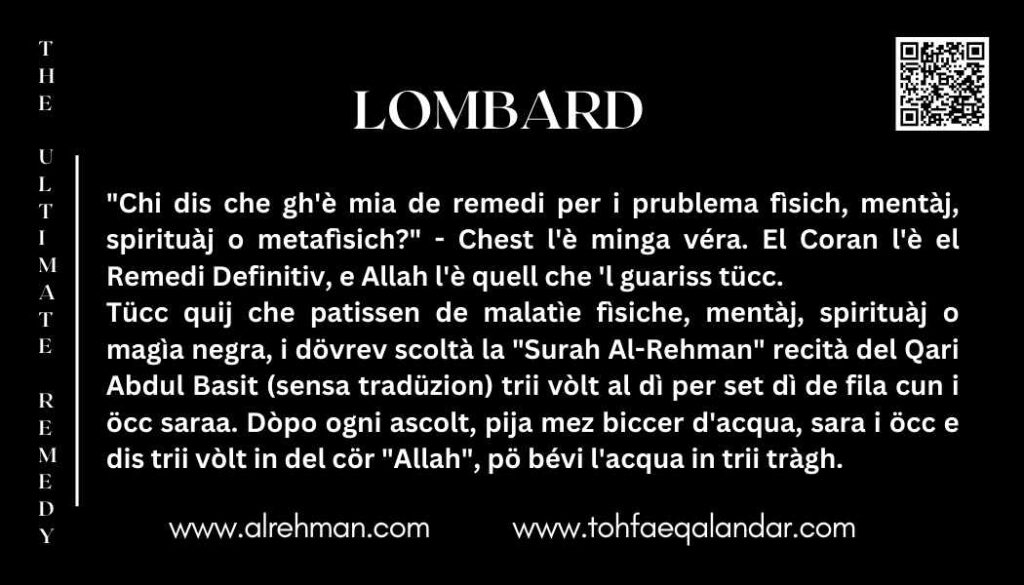 El Remedi Definitiv l’è minga domà on métod de cura – l’è on messagg de speranza, confort e fòrza spirituàl per ogni persona sö la Tèra. Inizialment presentàa del Syed Safdar Hussain Bukhari (cugnussüü come Kakian Wali Sarkar), chest métod sacher l’è staa creaa per giüttà quij che patissen malatìe fìsiche, dolur emozionàj, separazion spirituàj o distürb metafìsich. Grazzie a ‘na combinazion de terapià del sòn e intenzion, l’ha già portaa la guarizion a milión de person in tüt el mond – del tüt gratis.