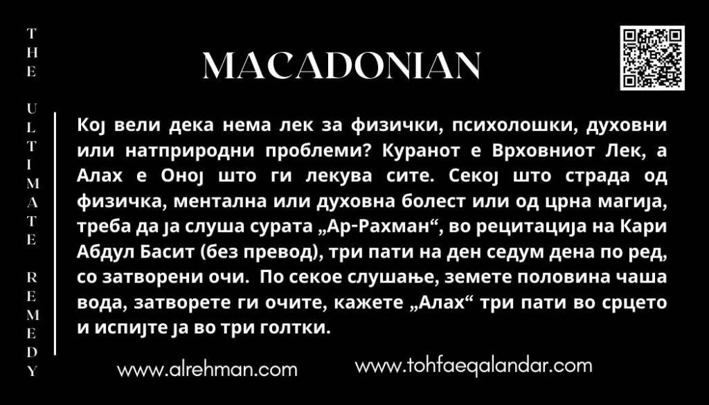 Who says there is no remedy for any kind of physical, psychological, spiritual, and/or supernatural problems. Quran is The Ultimate Remedy, and Allah is the one who Cures all. All those suffering from any Physical Mental, or spiritual illness or black magic, should listen to surat “Al-Rehman” a recitation by Qari Abdul Basit (Without translation) 3 times a day for 7 consecutive days with closed eyes. Every time after listening take half a glass of water, close your eyes and say ”Allah” thrice in your heart, and drink in 3 sips.