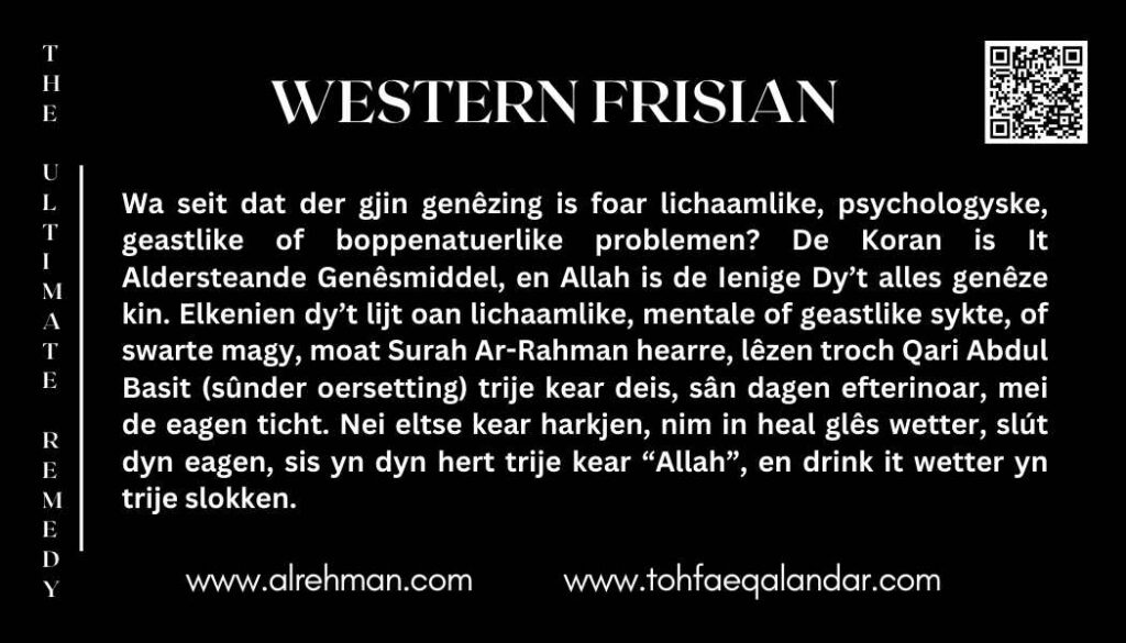 It Aldersteande Genêsmiddel is net allinnich in metoade om te genêzen—mar in boadskip fan hoop, treast en geastlike krêft foar eltse minske op ierde. It waard foar it earst yntrodusearre troch Syed Safdar Hussain Bukhari, ek bekend as Kakian Wali Sarkar. Dizze hillige metoade is makke om minsken te stypjen dy’t lije oan lichaamlike sykten, emosjoneel lijen, geastlike skieding, of metafysyske steuringen. Troch de kombinaasje fan lûdsterapy en oprjocht doel, hat it al miljoenen minsken oer de hiele wrâld genêzing brocht—folslein fergees.