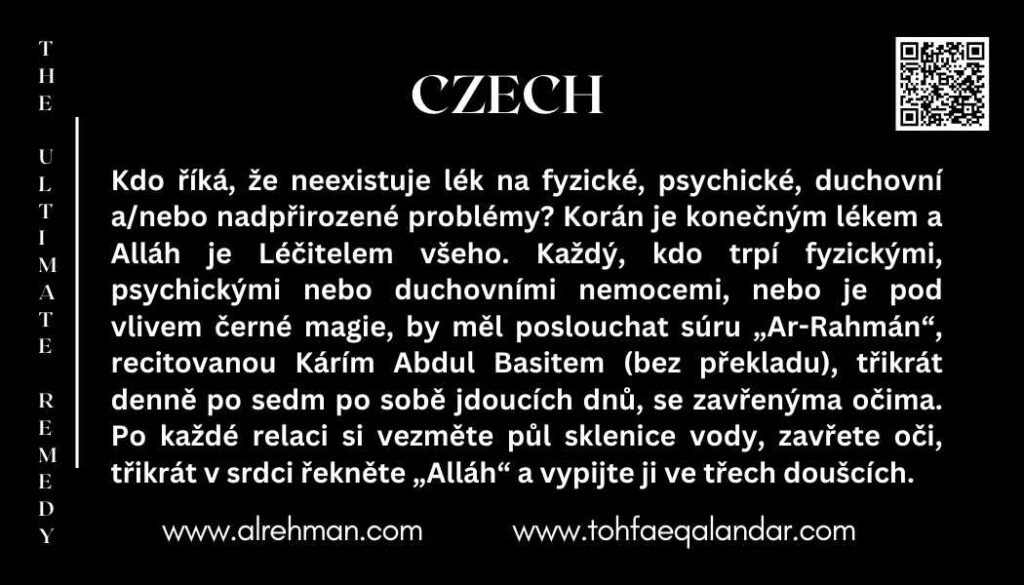Konečný Lék není jen léčebná metoda – je to poselství naděje, útěchy a duchovní síly pro každého člověka na Zemi. Původně představený Syedem Safdarem Hussainem Bukharim (známým jako Kakian Wali Sarkar), tato posvátná metoda je navržena na pomoc těm, kteří trpí fyzickou nemocí, emocionální bolestí, duchovním odpojením nebo metafyzickou poruchou. Kombinací zvukové terapie a záměru již přinesla uzdravení milionům lidí po celém světě – zcela zdarma.