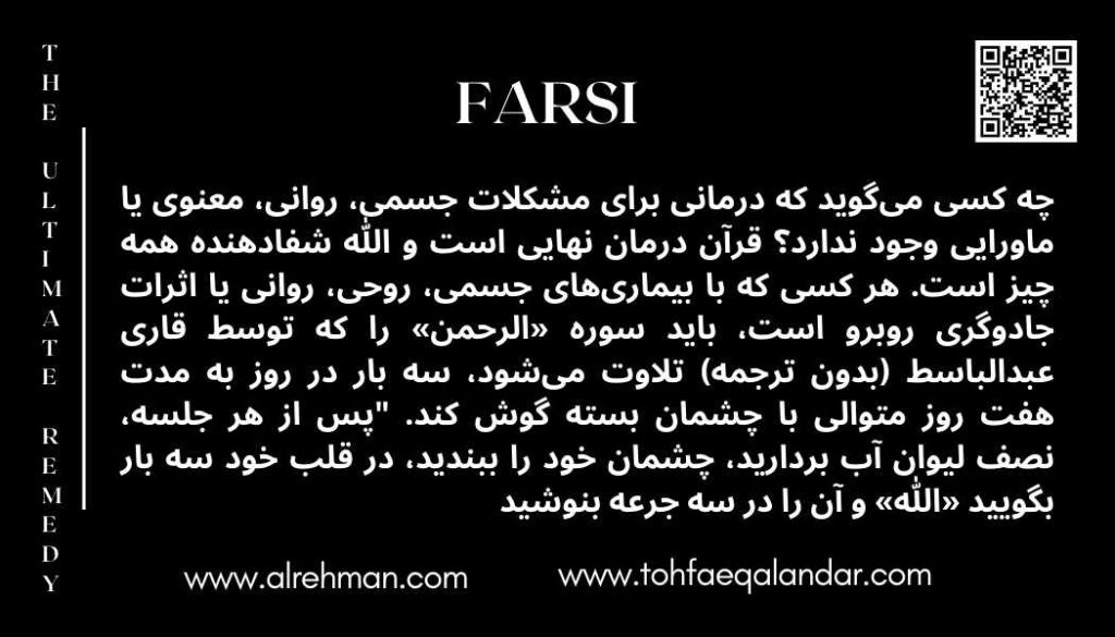 All those suffering from any Physical Mental, or spiritual illness or black magic, should listen to surat “Al-Rehman” a recitation by Qari Abdul Basit (Without translation) 3 times a day for 7 consecutive days with closed eyes. Every time after listening take half a glass of water, close your eyes and say ”Allah” thrice in your heart, and drink in 3 sips.