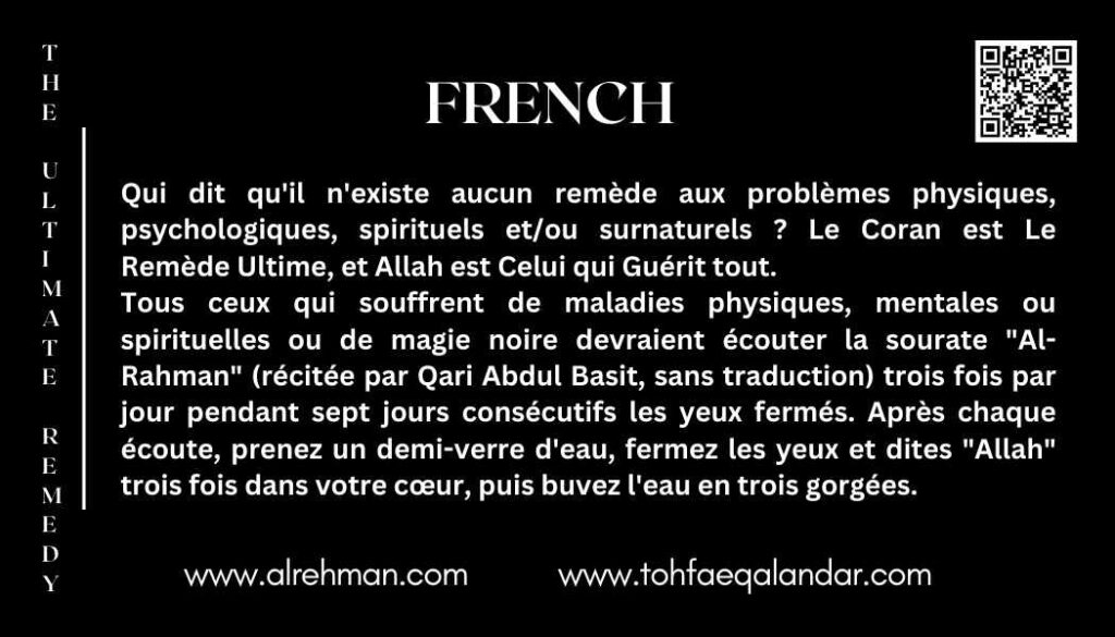 All those suffering from any Physical Mental, or spiritual illness or black magic, should listen to surat “Al-Rehman” a recitation by Qari Abdul Basit (Without translation) 3 times a day for 7 consecutive days with closed eyes. Every time after listening take half a glass of water, close your eyes and say ”Allah” thrice in your heart, and drink in 3 sips.