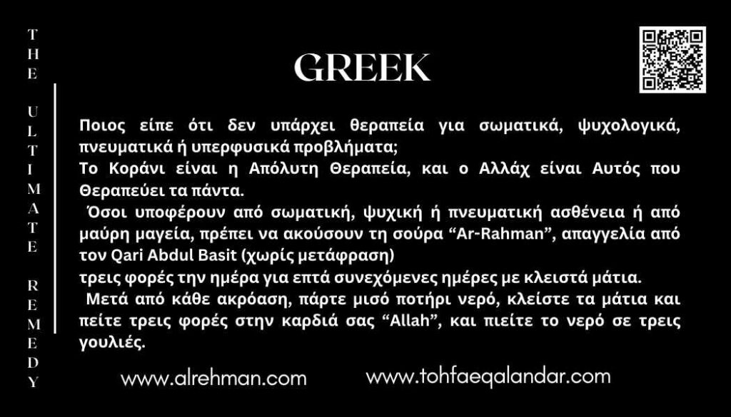 All those suffering from any Physical Mental, or spiritual illness or black magic, should listen to surat “Al-Rehman” a recitation by Qari Abdul Basit (Without translation) 3 times a day for 7 consecutive days with closed eyes. Every time after listening take half a glass of water, close your eyes and say ”Allah” thrice in your heart, and drink in 3 sips.