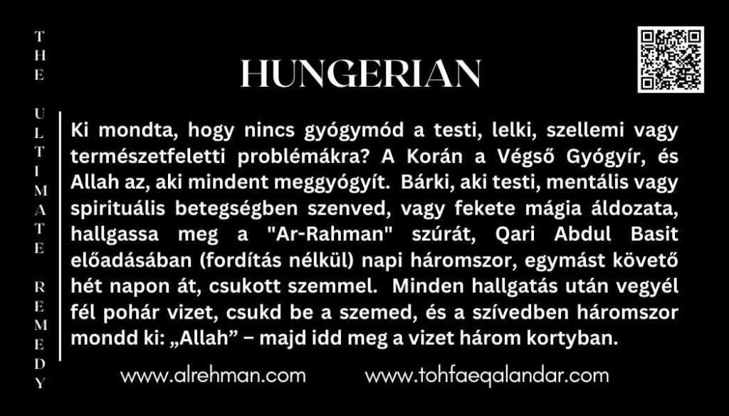 A Végső Gyógyír nem csupán egy gyógyító módszer – ez egy üzenet a reményről, a megnyugvásról és a spirituális erőről minden ember számára a Földön. Ezt a szent módszert Syed Safdar Hussain Bukhari mutatta be először, akit Kakian Wali Sarkarként ismernek. Ez a módszer azok támogatására szolgál, akik testi betegségekkel, érzelmi fájdalmakkal, lelki eltávolodással vagy metafizikai zavarokkal küzdenek. A hangterápia és a szándék együttes erejével ez a módszer már emberek millióinak segített világszerte – teljesen ingyenesen.
