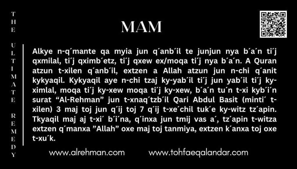 - Aj t-xi´ t-xnaq´tza´n junjun sesión, q´inxa jun tmij vas a´, tz´apin t-witza juntl majl, extzen t-xnaq´tza´na juntl maj “Allah,” “Dios,” moqa alkyexku juntl b´ib´etz xjan n-ok tnimana —oxe maj toj tanmiya. Yajxitl, k´anxa a´ toj oxe t-xaq.