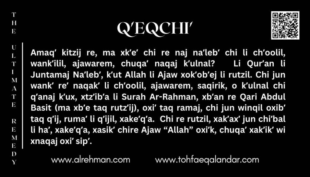 3. Xakow jun chʼoolil wachoch, xakeʼqʼa li naqal, xasikʼ chire – xbʼeʼsaj chire Ajaw, “Allah”.