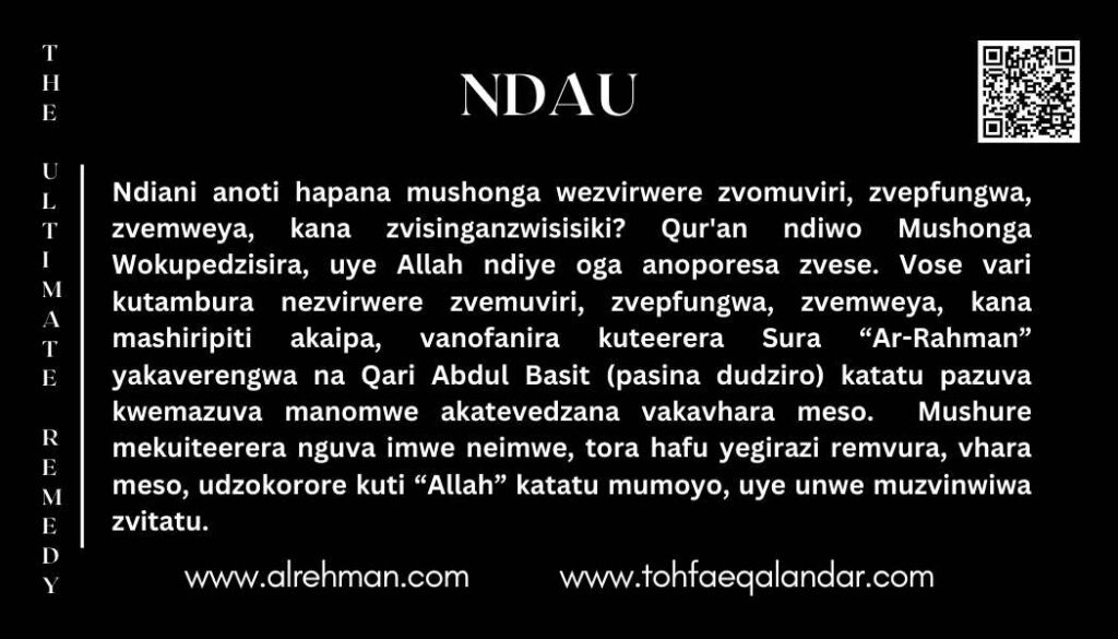 Mushonga Wokupedzisira hauzi kungori nzira yokuporesa chete — i shoko re tariro, nyaradzo, uye simba remweya kune munhu wese ari pasi pano. Pakutanga wakauyiswa na Syed Safdar Hussain Bukhari, anozivikanwa sa Kakian Wali Sarkar. Nzira ino yatsvene yakagadzirirwa kubatsira avo vari kutambura nezvirwere zvemuviri, marwadzo epfungwa, kusabatana kwemweya, kana kusagadzikana kwemweya. Kuburikidza nekubatanidzwa kworuzha runoporesa uye chinangwa chakanaka, yatounza kuporesa kuvanhu mamirioni pasi rose — zvachose pasina mubhadharo.