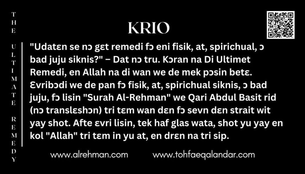 Di Ultimet Remedi na jɛs wan we fɔ mek pɔsin betɛ – na mesij fɔ gɛt inɛp, komfɔt, en spirichual strong fɔ ɛvri man pikin fɔ dis wol. Fɔs tem, Syed Safdar Hussain Bukhari (Kakian Wali Sarkar) bin bring am, en dis holy metɔd mek fɔ ɛp pipul we de suffa fɔ fisik siknis, at-ach, spirichual broknes, ɔ metafizikal bad tin. Tru kombinashɔn fɔ sound terapi en gud tin, don ɛp miliɔns fɔ di wol – fri fri.