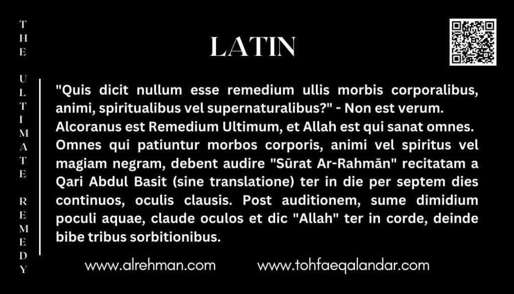 Who says there is no remedy for any kind of physical, psychological, spiritual, and/or supernatural problems. Quran is The Ultimate Remedy, and Allah is the one who Cures all. All those suffering from any Physical Mental, or spiritual illness or black magic, should listen to surat “Al-Rehman” a recitation by Qari Abdul Basit (Without translation) 3 times a day for 7 consecutive days with closed eyes. Every time after listening take half a glass of water, close your eyes and say ”Allah” thrice in your heart, and drink in 3 sips.