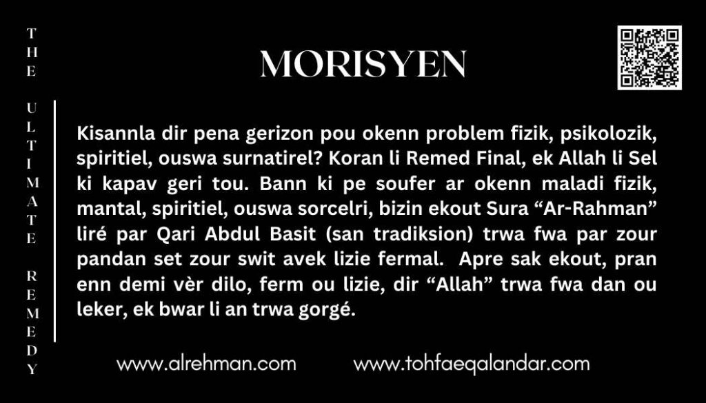 Remed Final pa zis enn metod gerizon — li enn mesaz lespwar, konfor ek lafors spiritiel pou sak dimounn lor later. Li ti prezante pou premie fwa par Syed Safdar Hussain Bukhari, ki dimounn kone kouma Kakian Wali Sarkar. Sa metod sakre-la inn kree pou ed bann ki pe soufer ar maladi fizik, douler emosyonel, separasion spiritiel, ouswa problem metafizik. Avek enn kombinazon terapi son ek bon lintansion, li finn deza amenn gerizon pou plizir milyon dimounn dan lemond — net gratis.