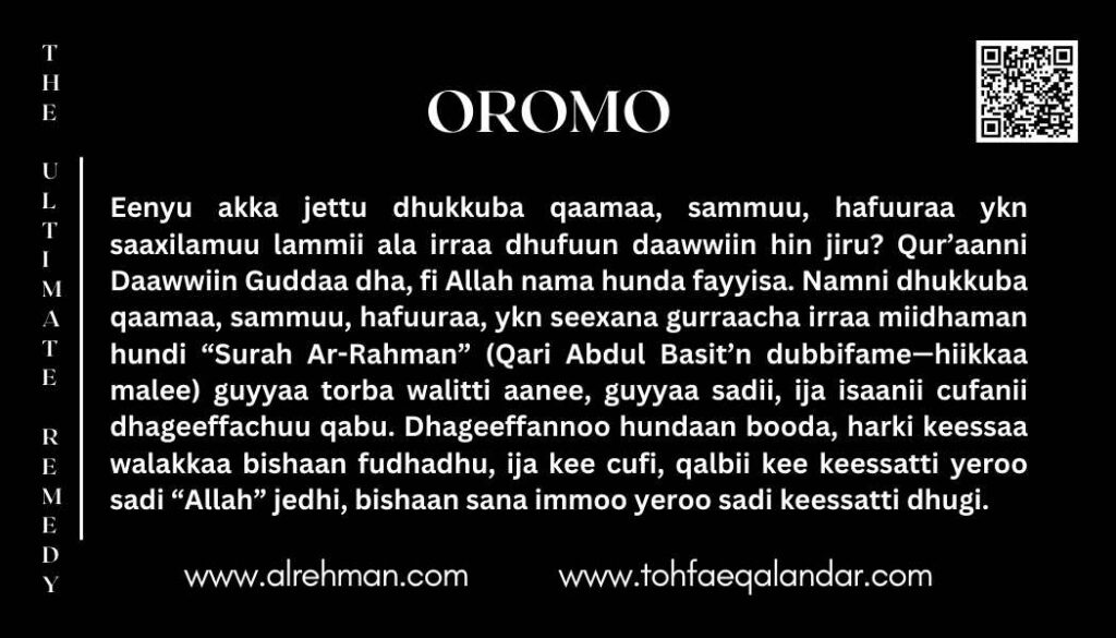 - Bakka tasgabbaa’aa fili, ija kee cufi, qalbii guutuu fi dhugaa dhageeffadhu—Humna Ol’aanaa ykn Jaalala Addunyaa waliin walitti hidhamuun.