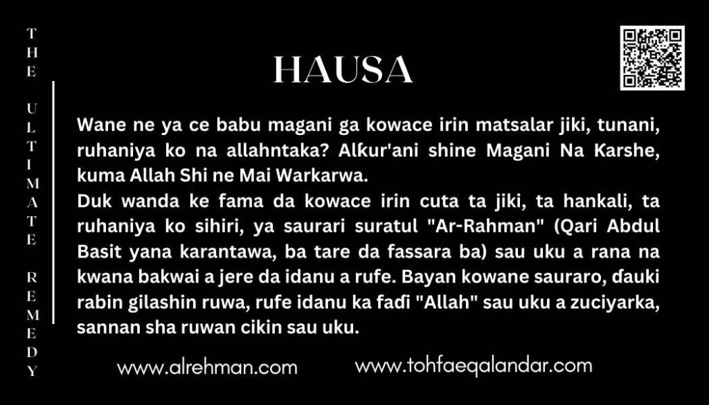 Magani Na Ƙarshe ba kawai hanyar warkarwa ba ce – saƙo ne na bege, ta’aziyya da ƙarfin ruhaniya ga kowane ɗan adam a duniya. Syed Safdar Hussain Bukhari (Kakian Wali Sarkar) ne ya gabatar da shi, wannan tsarkakakkiyar hanya tana taimakawa masu fama da rashin lafiya, baƙin ciki, rashin haɗin kai na ruhaniya ko rikicewar metaphysical. Ta hanyar amfani da maganin sauti da niyya, ya riga ya warkar da miliyoyin mutane a duniya – kyauta.