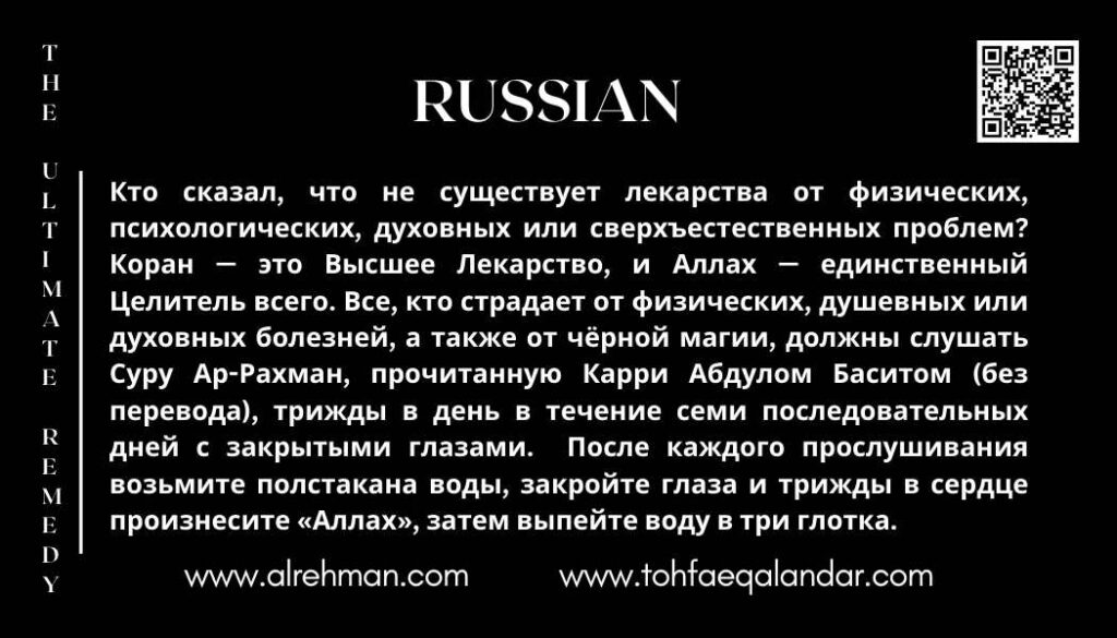 Who says there is no remedy for any kind of physical, psychological, spiritual, and/or supernatural problems. Quran is The Ultimate Remedy, and Allah is the one who Cures all. All those suffering from any Physical Mental, or spiritual illness or black magic, should listen to surat “Al-Rehman” a recitation by Qari Abdul Basit (Without translation) 3 times a day for 7 consecutive days with closed eyes. Every time after listening take half a glass of water, close your eyes and say ”Allah” thrice in your heart, and drink in 3 sips.